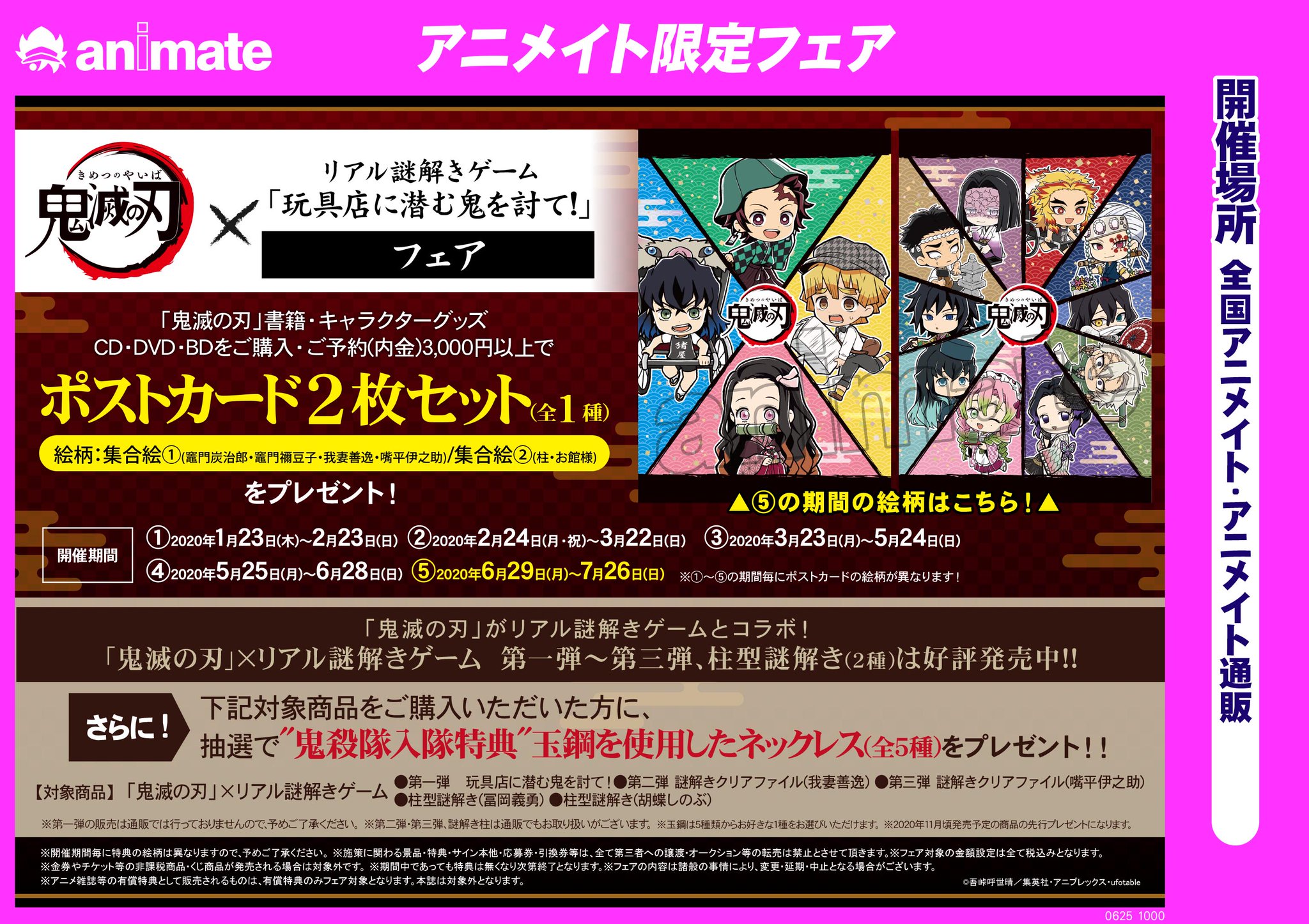 『鬼滅の刃』×リアル謎解きゲーム"玩具店に潜む鬼を討て!"フェア 開催期間 1月23日~7月26日 開催場所 全国アニメイト 内容 期間中、『鬼滅の刃』書籍・キャラクターグッズ・CD・DVD・Blurayを購入・予約3,000円以上で特典をプレゼント 特典:Apr 19, 21 · アニメイト(東京都板橋区)は21年4月19日、全国のアニメイトとアニメイト通販で23日から5月16日まで開催する「ジャンプフェアinアニメイト21Apr 16, 21 · 株式会社アニメイトホールディングスのプレスリリース(21年4月16日 18時05分)『劇場版鬼滅の刃無限列車編』のBluray・DVDが6/16発売